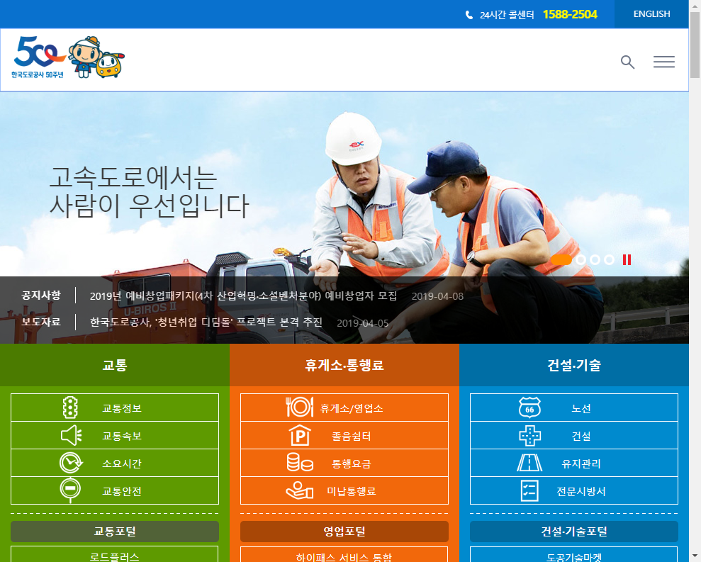 한국도로공사웹페이지에 방문한 첫페이지 입니다. 가운데 주황색의 휴게소.통행료 있습니다. 아래로 보시면 '통행요금' 항목이 있습니다.