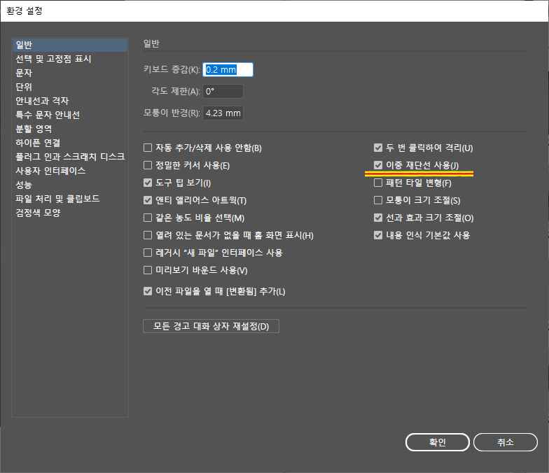 위와 같은 내용으로 보입니다. 오른쪽 보시면 '이중 재단선 사용' 이렇게 되어 있습니다. 그 체크박스를 제거하고 아래 확인 누르시면 끝입니다. 영문일러스트의 경우 이 정도 위치에 있습니다. 내용들이 상하배열이 다르니 잘 보시면 됩니다.