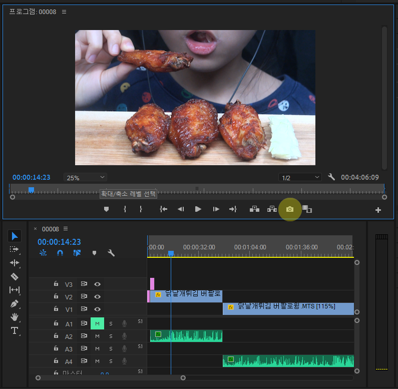 프리미어에 촬영된 영상을 플레이합니다. 사진으로 사용될 곳에 멈춥니다. 타임라인 아래로 '카메라 모양의 아이콘'이 보입니다. 그곳을 선택해 저장을 합니다.