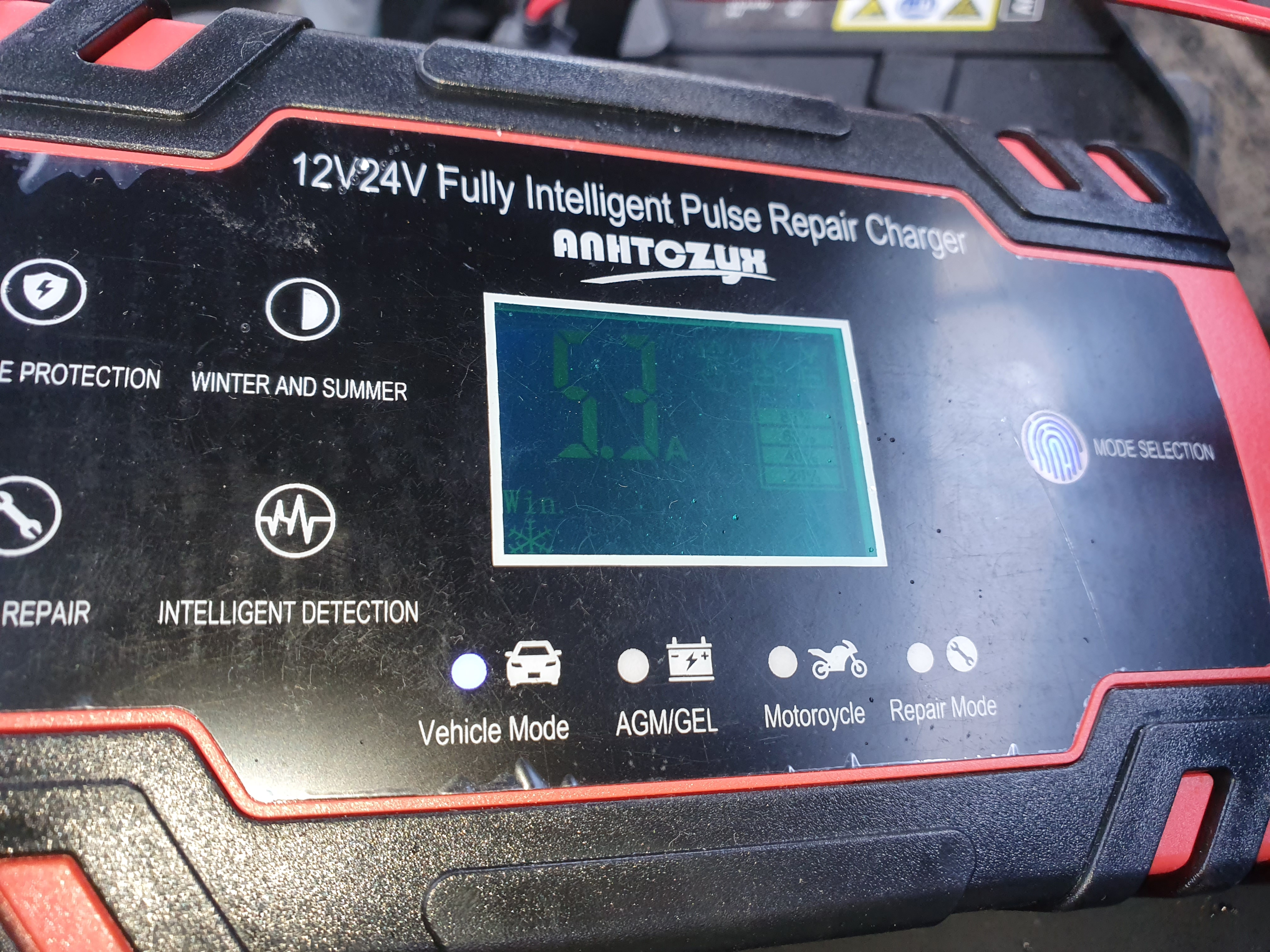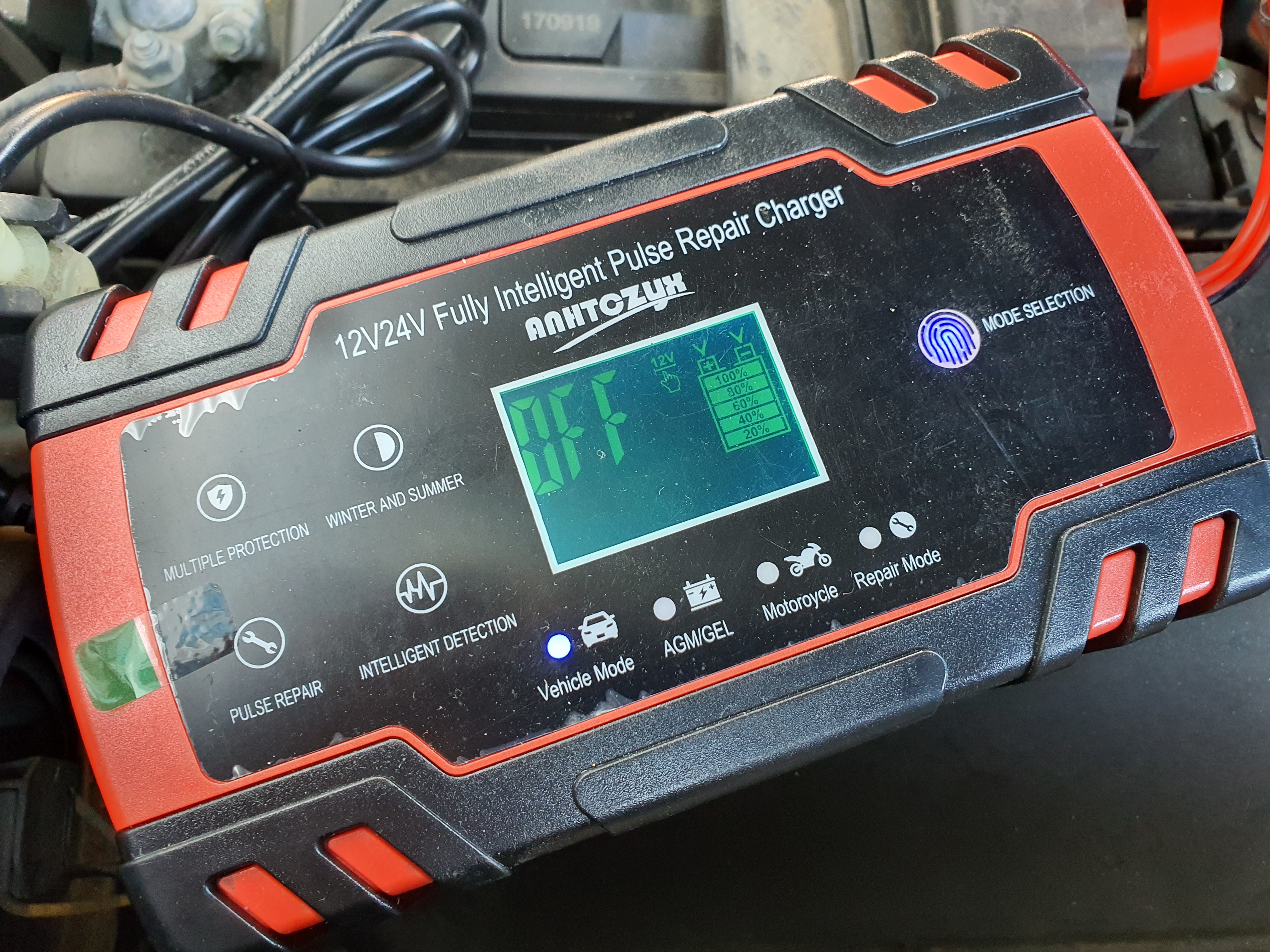 제가 구입한 모델입니다. 4종류의 옵션으로 1개의 버튼을 터치해 선택할 수 있습니다. 자동차에 장착한 상태로 충전이 가능하고요, 밧데리를 분리해 충전하는 방법으로도 가능합니다. 자동차 모양의 아이콘에 놓고 저는 자가용, 트럭에 집게를 물려봤습니다. 참고, 빨강색 +단자 / 검정색 -단자...에 연결하시면 됩니다. 혹 서로 반대로 잘못 연결했어도 고장나고 그러지는 않습니다.
