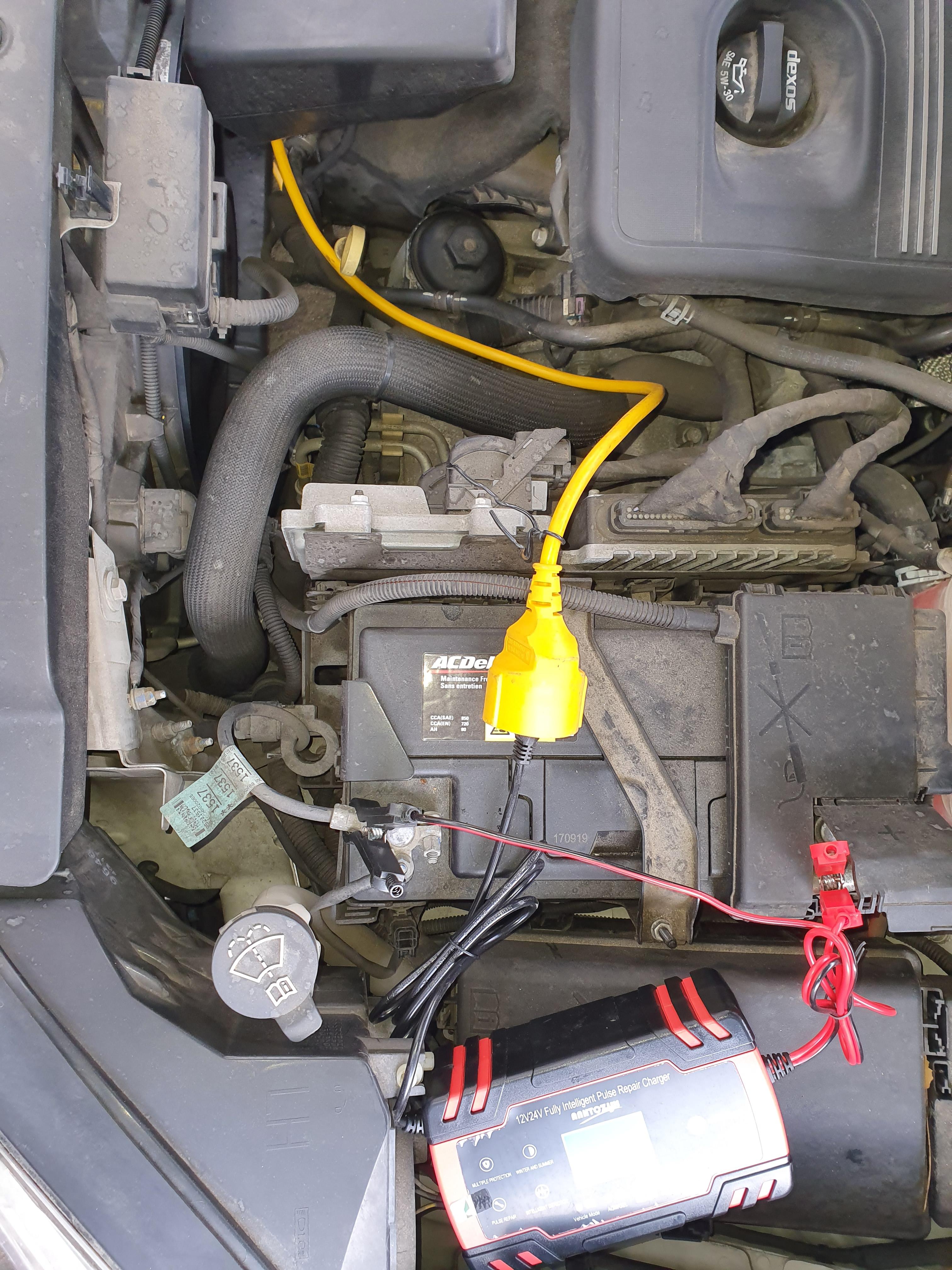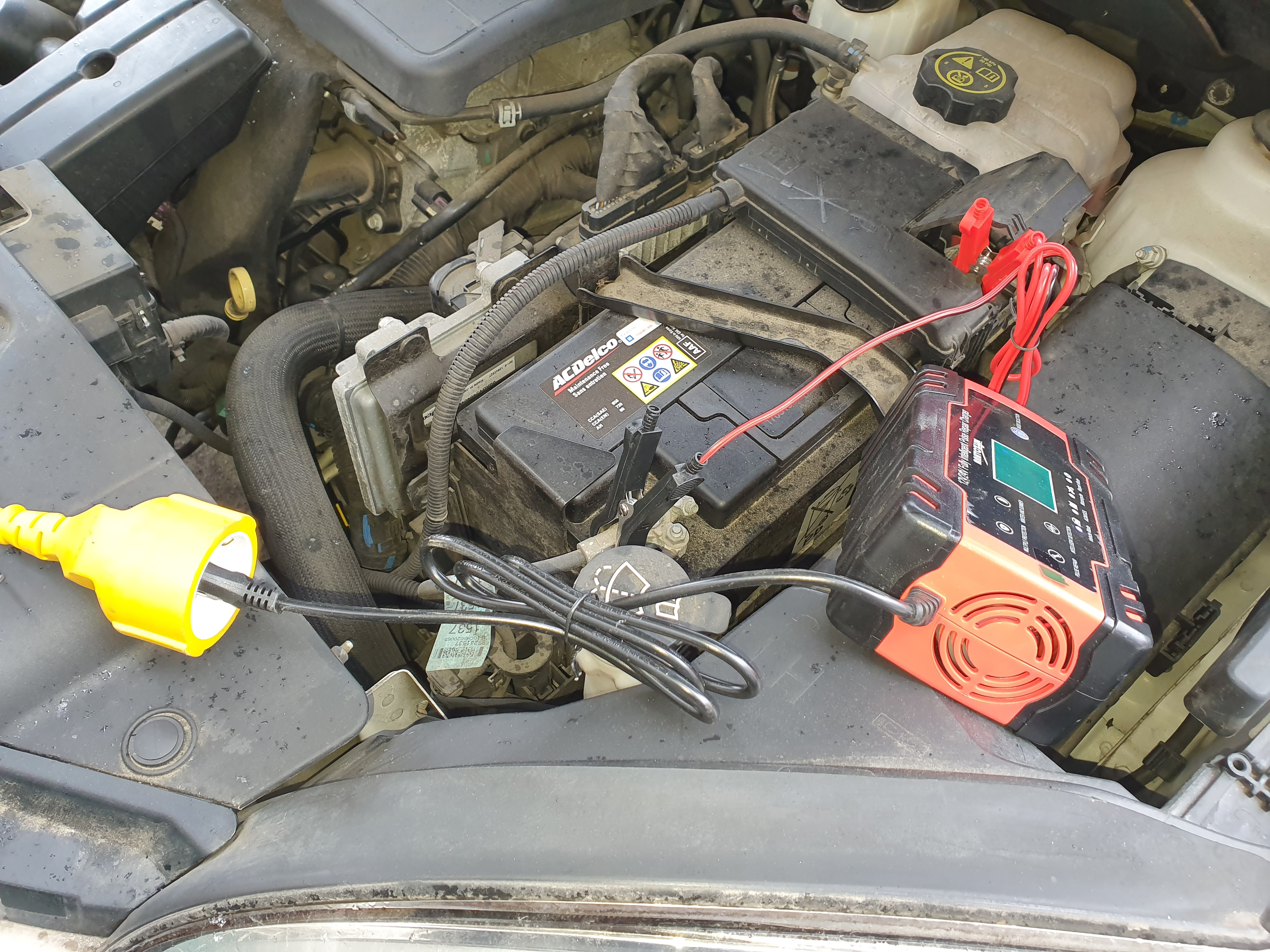 먼저 자가용에 전기를 끌어다가 연결해 봤습니다. 위 사진처럼 적당히 집게를 물리면 끝입니다. 보닛을 열어 놓은 채 다른 일을 보기에는 충전이 너무 올래 걸립니다. 저 같은 경우에는 눈이 오는 날이었거든요. 리드선을 차량 밑으로 내려서 보닛을 닫을 수 있도록 선 정리를 하면 좋습니다. 완전 충전 까지는 5시간 이상 걸리는 듯 합니다.