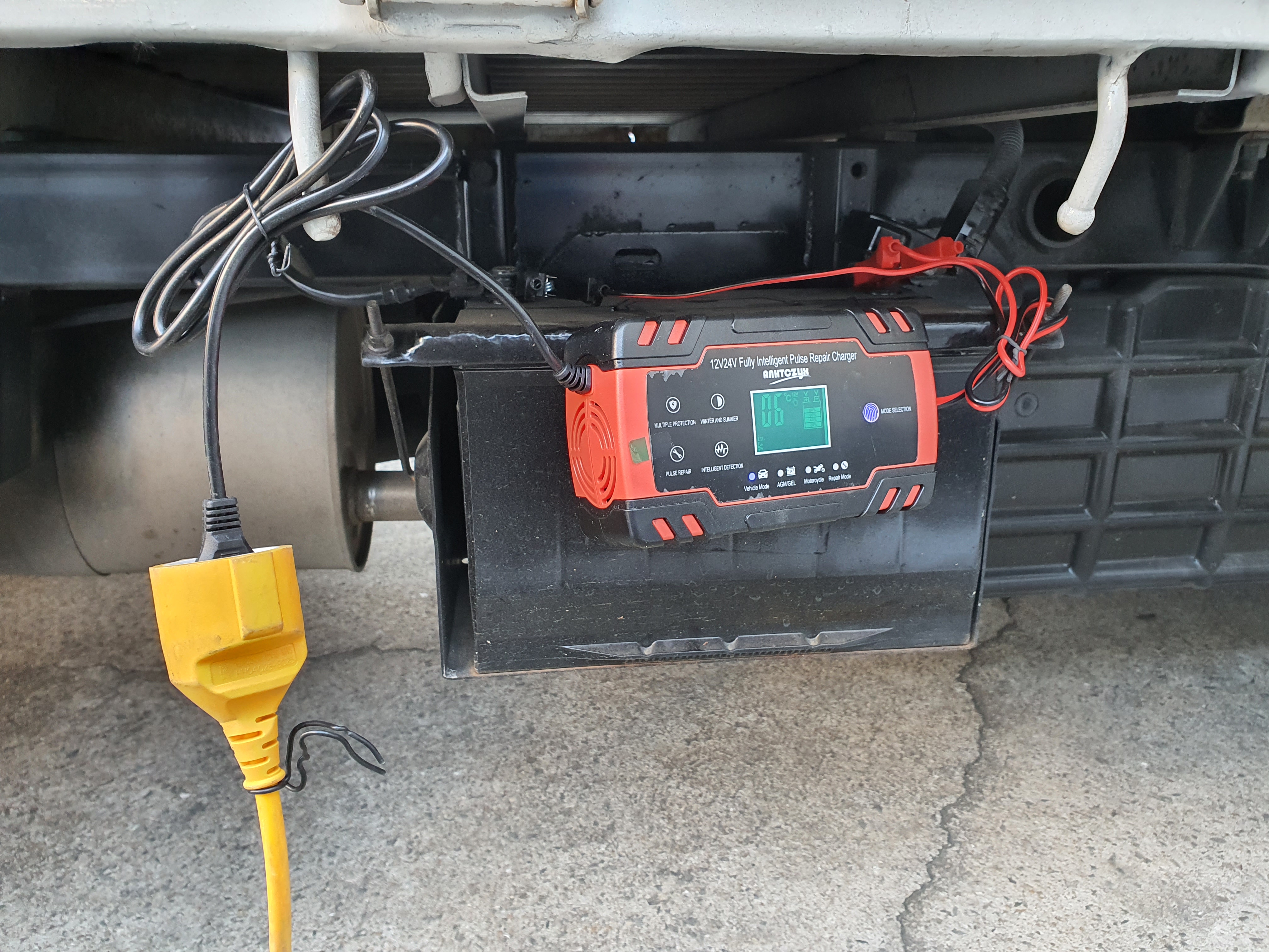 트럭은 집게 연결이 더욱 쉽습니다. 충전기기 만 떨어지지 않게 잘 고정시켜놓고 연결하시면 됩니다. 트럭은 자주 타서 배터리 충전시간이 오래가지는 않겠네요. 트럭의 경우 겨울에 온도가 한참 아래로 내려가면 시동이 안걸릴 수 있습니다. 위 사진처럼 설치 후 시동을 걸면 잘 될 거 같습니다.