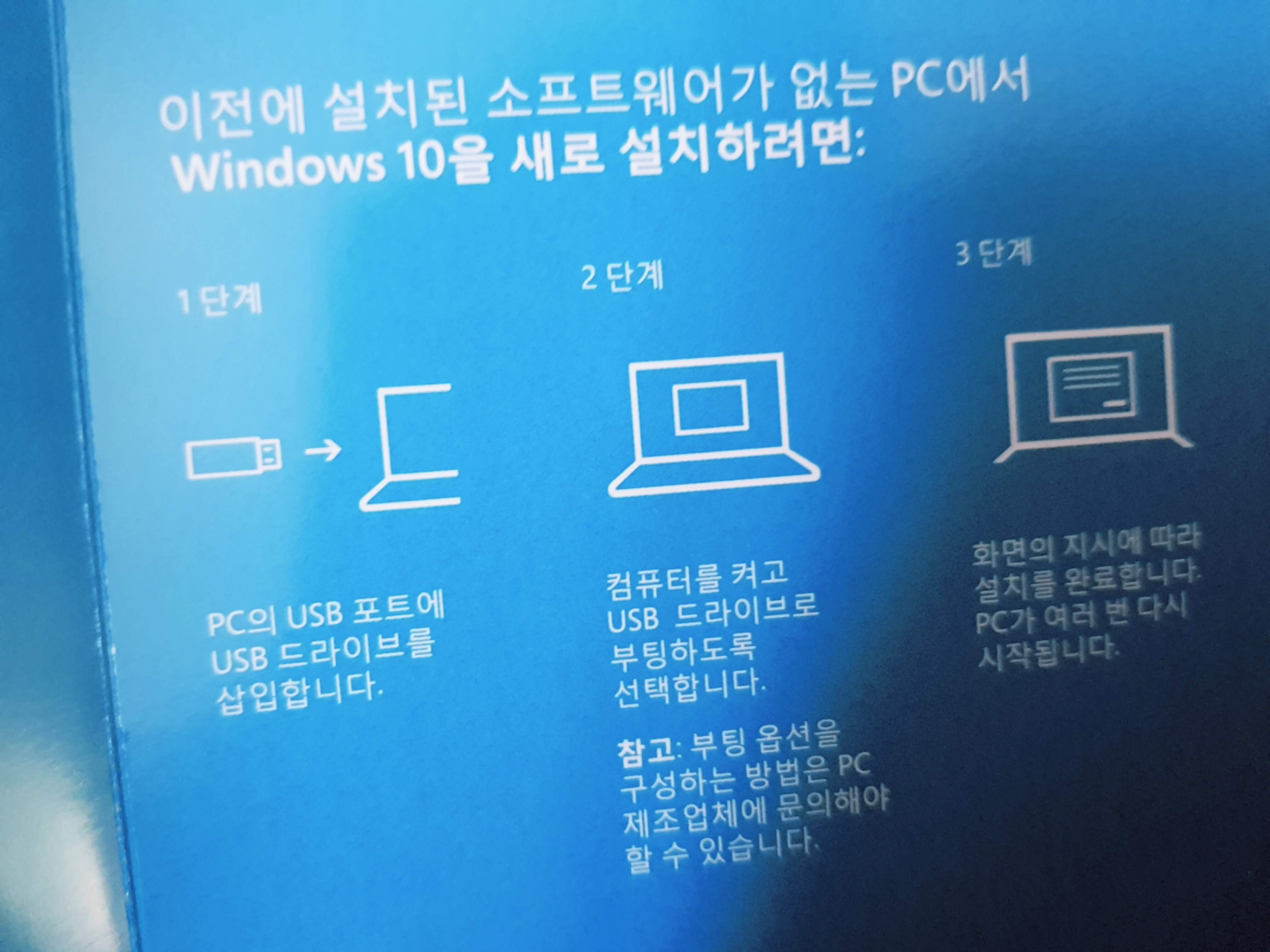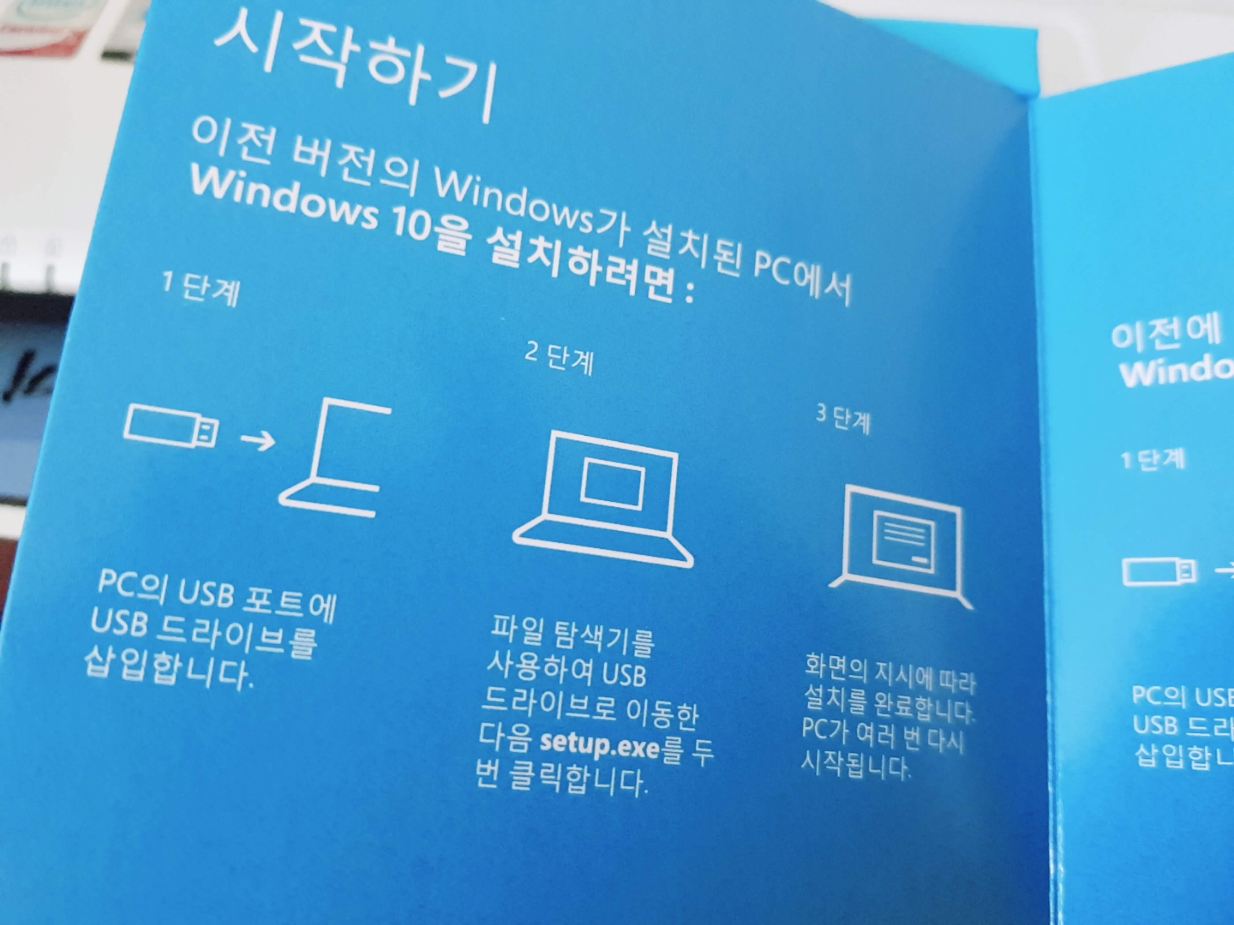 안에 내용물을 보면 쉽게 따라할 수 있는 설명서, Windows 10 Home 제품 키, USB...있습니다. USB에 1cm 만큼 스티커모양의 것이 있는데요. 맨 오른쪽 사진에도 보입니다. 그것을 잡아당기면 USB를 꺼낼 수 있습니다. 문제는 그것을 떼 버리면 안되고 있는 모양대로 자신의 컴퓨터 USB에 꽂으시면 됩니다.