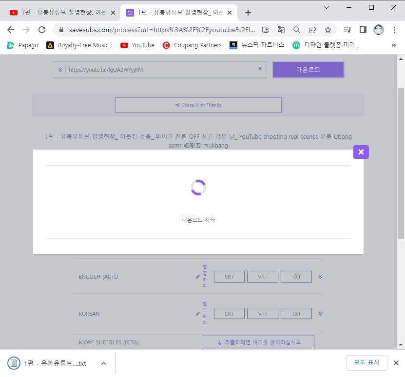 ⑤'다운로드'버튼을 선택하면, 자막을 다운로드 합니다.(▼아래사진)