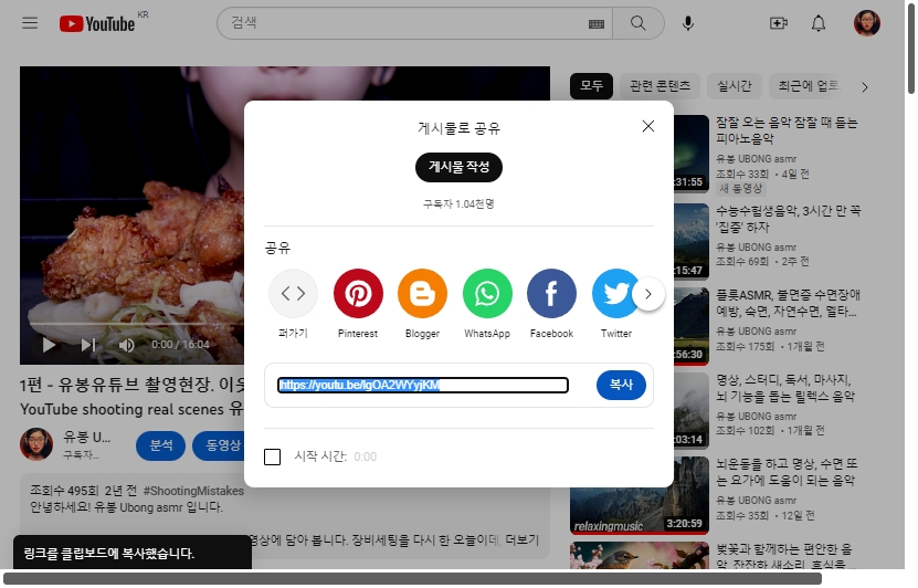 ②파란색 '복사'버튼을 선택해 유튜브주소를 복사합니다.(▼아래사진)