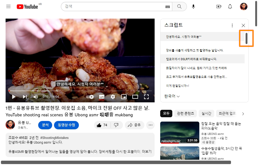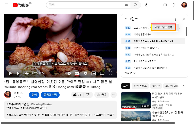 ⑥영상 오른쪽으로 '시간+자막'이 보이는 '스크립트' 창이 보이게 됩니다. 세로로 점3개를 선택합니다.(▼아래사진)