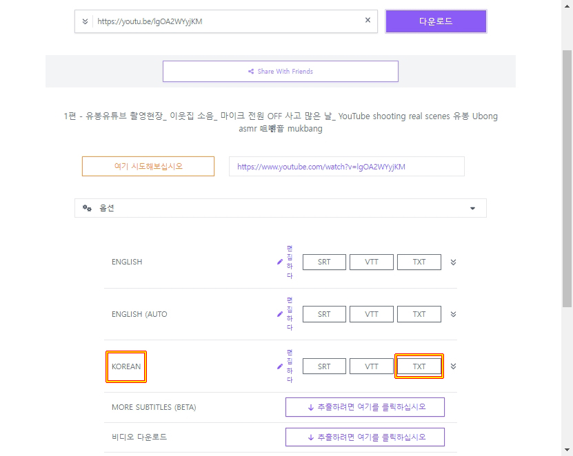 ⑥다운로드가 완료되면, 화면 밑으로 옵션들이 나타나게 됩니다. 'KOREAN'확인 하신 후 오른쪽으로 'TXT'버튼을 선택합니다.(▼아래사진)