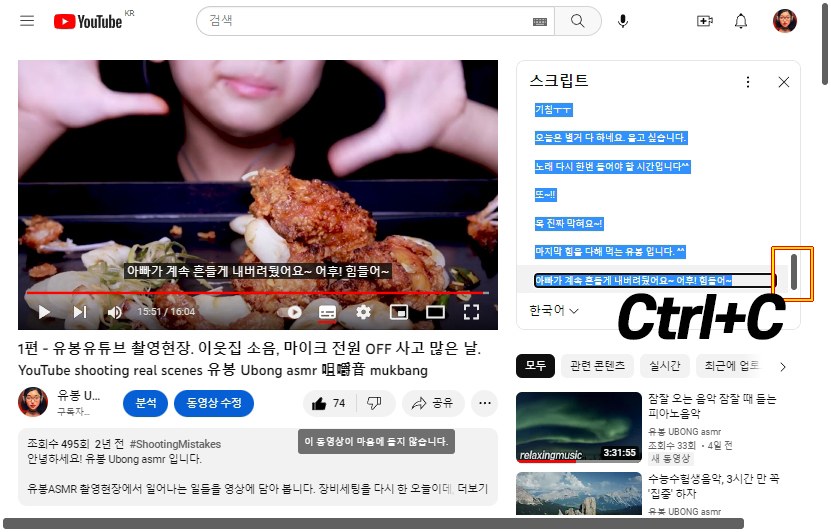 이제 파란색의 자막을 메모장으로 옮겨놓을 것입니다. 복사단축키 'Ctrl+C'를 누룹니다.(▼아래사진)