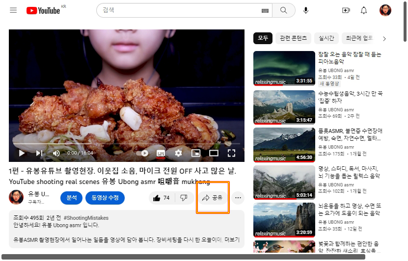 ①유튜브에 접속합니다. 영상 아래로 '공유'를 선택합니다.(▼아래사진)