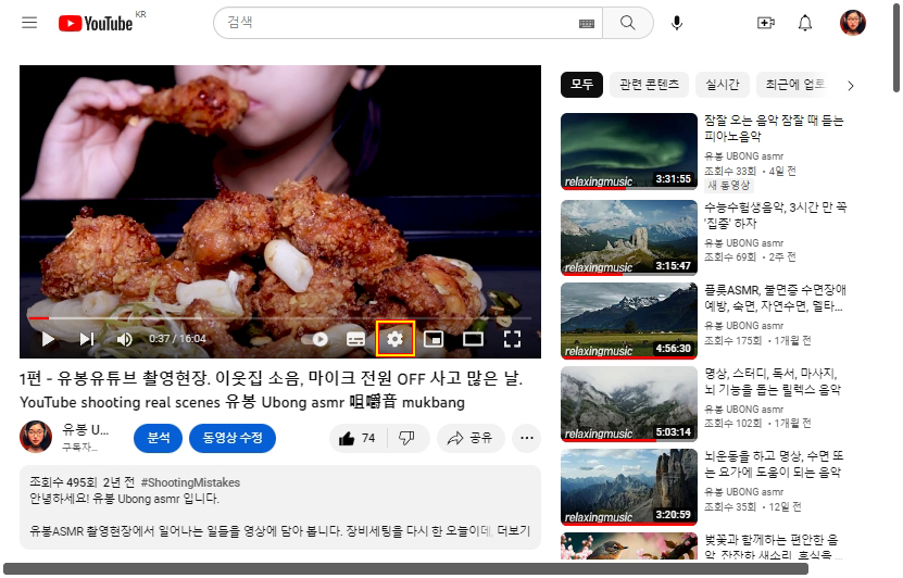 ①유튜브에 접속합니다. 이후 화면을 보면 '톱니바퀴 모양의 아이콘'을 선택(▼아래그림)