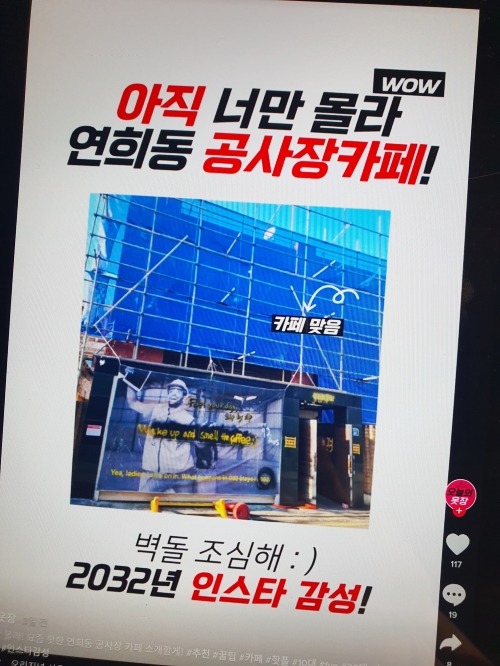 공사장 위 왼쪽사진이 현실입니다. 조금 큰현장, 작은현장 차이일 뿐 이런곳에 카페있다니?? 서울 한 공사장카페가 들어선 건물은 원래 다세대 주택이었으나 향후 브랜드 쇼룸으로 활용하기 위해 매입했다. 카페는 3개월 뒤 인테리어 공사가 시작될 때까지 벽지나 바닥 없이 임시로 운영됐다. 건설 현장 컨셉은 마감재를 사용하지 않고 파이프와 전선이 보이는 카페를 말한다. 초기 관심에도 불구하고 카페는 계속된 비판에 직면했고, 현장 점검 결과 안전상의 이유로 외부 발판과 내부 철제 계단을 철거하라는 권고를 받았다는 이야기도 있습니다.