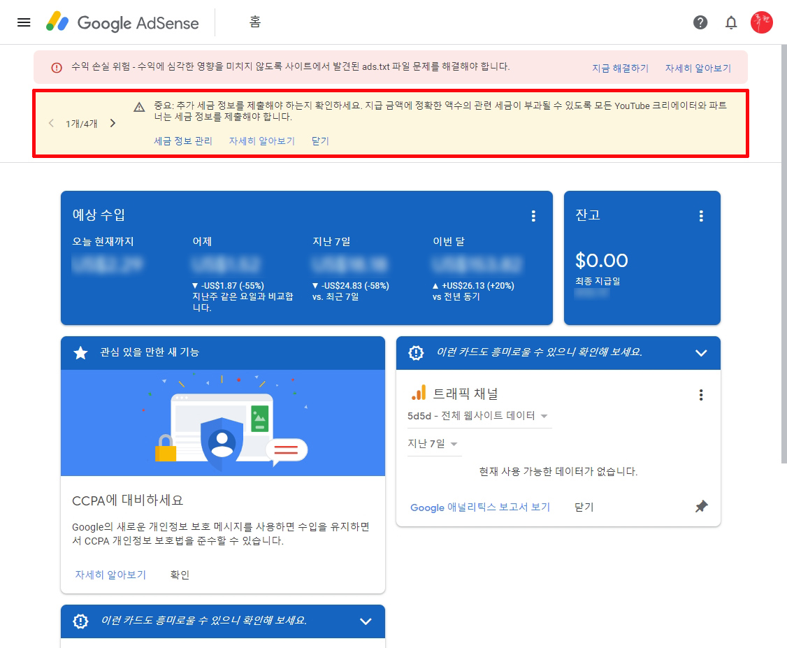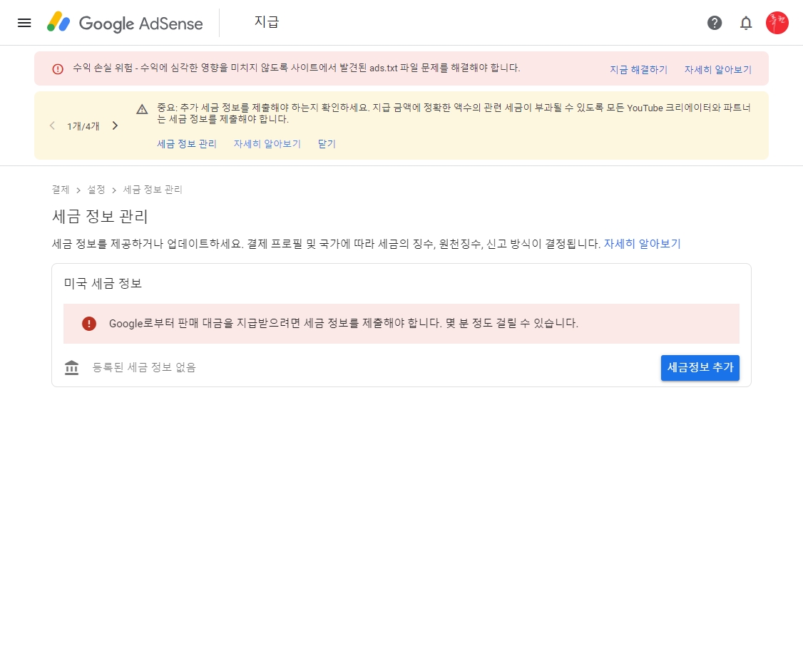 구글애드센스 로그인 후 상단에 나타나는 알림글이 확인되었습니다. '세금 정보 관리' 항목을 선택해 봅니다.