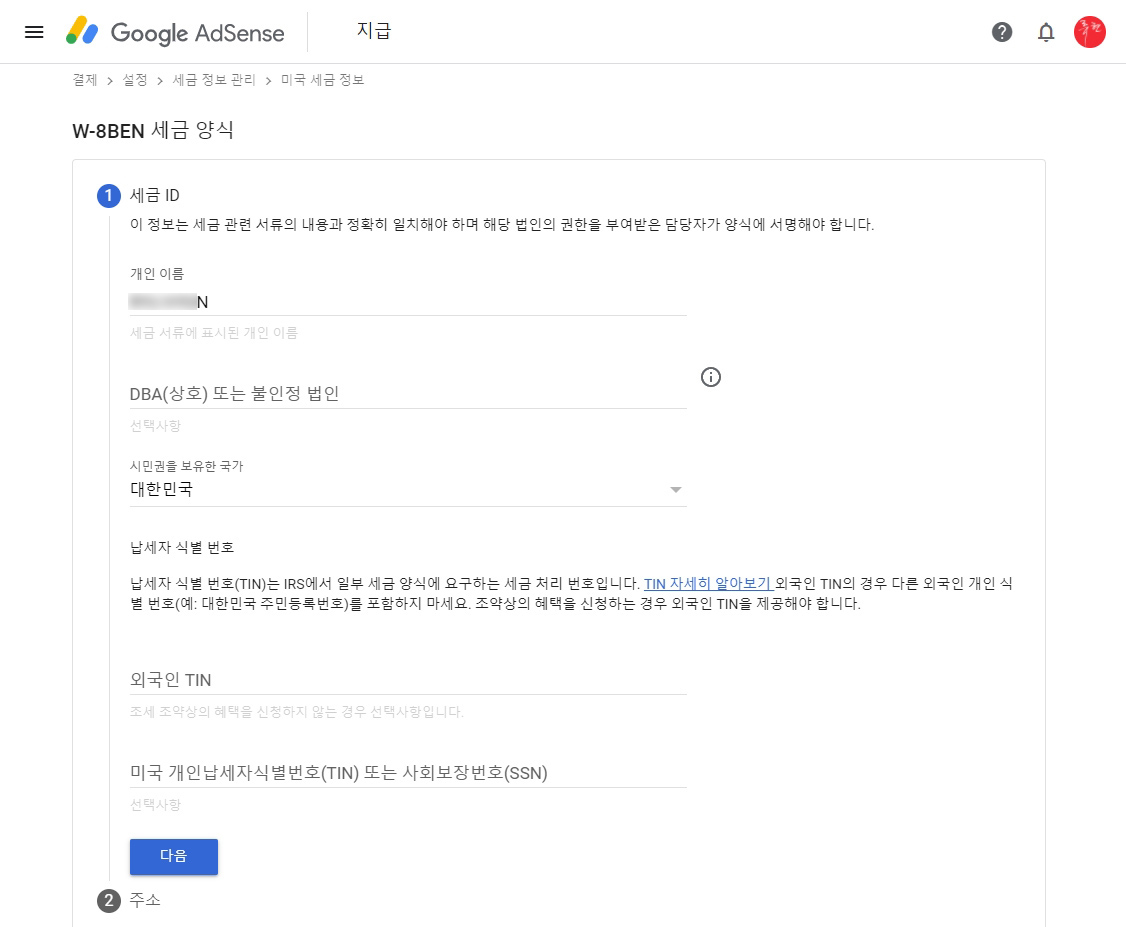 W-8BEN 세금양식 페이지가 나옵니다. 개인 이름은 '영문'으로 입력합니다. 밑에 'DBA(상호) 또는 불인정 법인', '납세자 식별 번호'...TIN 잘 모르면 빈칸으로 남겨두시면 됩니다. 그리고 다음~