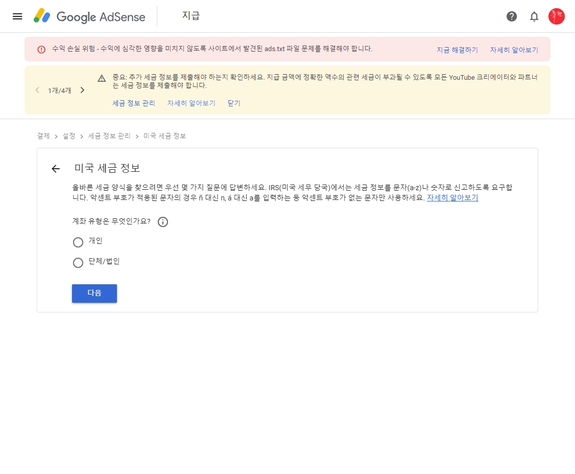 저는 개인사업자 이기에 '개인' 체크했습니다. 그리고 다음~~