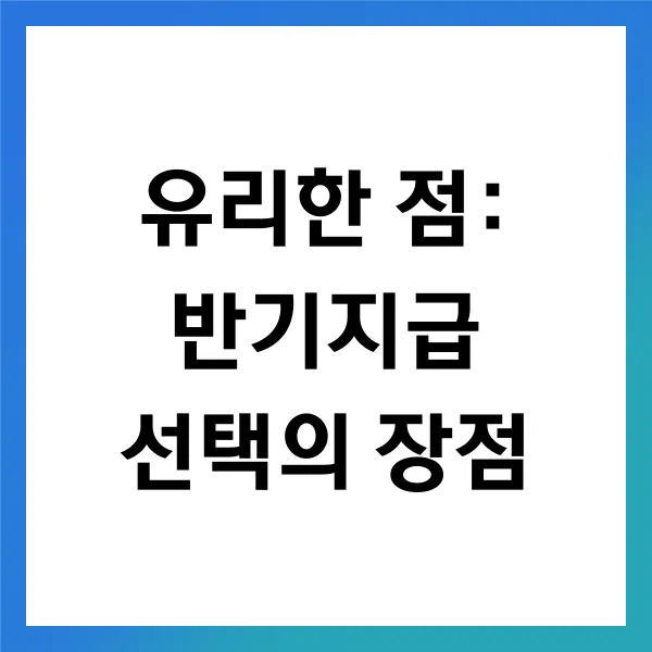 이렇듯 반기지급 선택은 여러 가지 측면에서 유리한 점을 가지고 있습니다. 즉각적이고 예측 가능한 현금 흐름, 소비 촉진, 세무적 이점, 그리고 간편한 절차까지! 이러한 요소들은 반기지급을 고려하는 많은 가구들에게 긍정적인 영향을 미칠 것입니다.