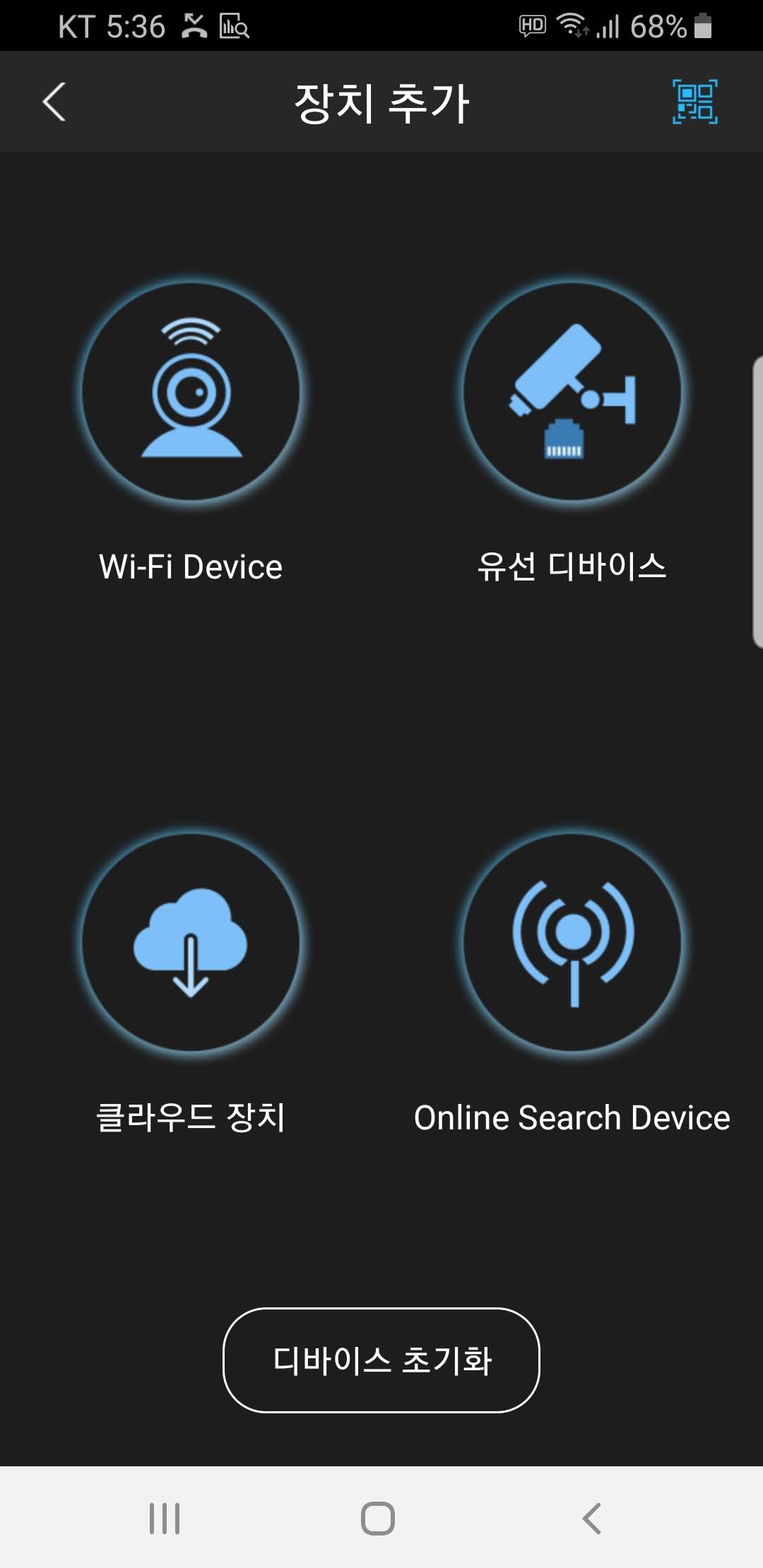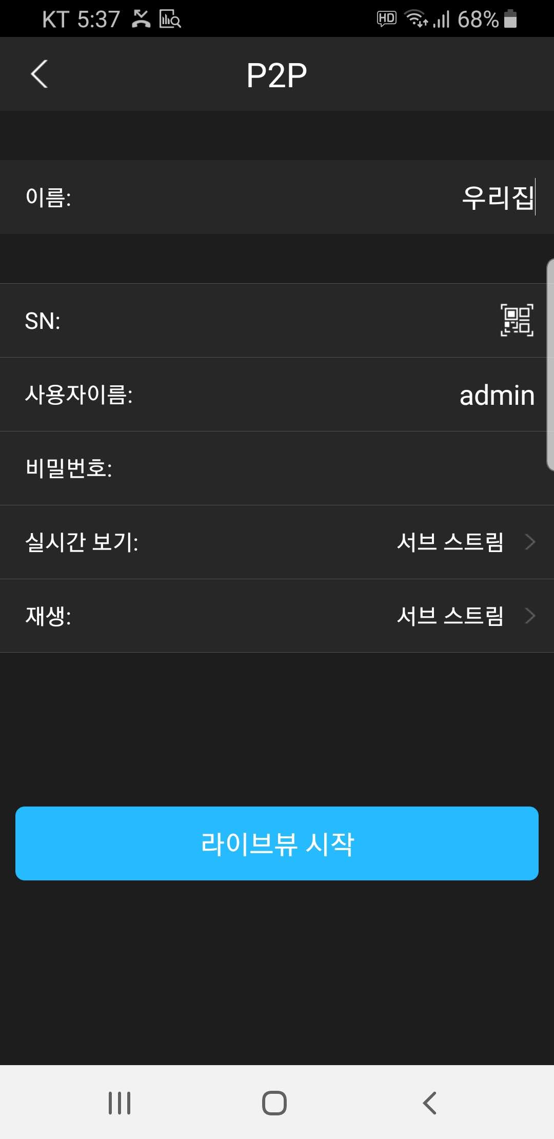 설치기사가 방문해서 오셨다면 케이블시공 했을 겁니다. 따라서 '유선 디바이스' 선택합니다. '장치추가' 항목에서는 'P2P ' 글씨를 선택합니다. 'P2P'페이지에서 'SN' 글씨 오른쪽으로 아이콘이 하나 보입니다. 선택하시고...이름 적당히 입력, 그리고 '비밀번호' 정확히 입력합니다. 마지막으로 '라이브뷰 시작' 버튼 누르면 끝~