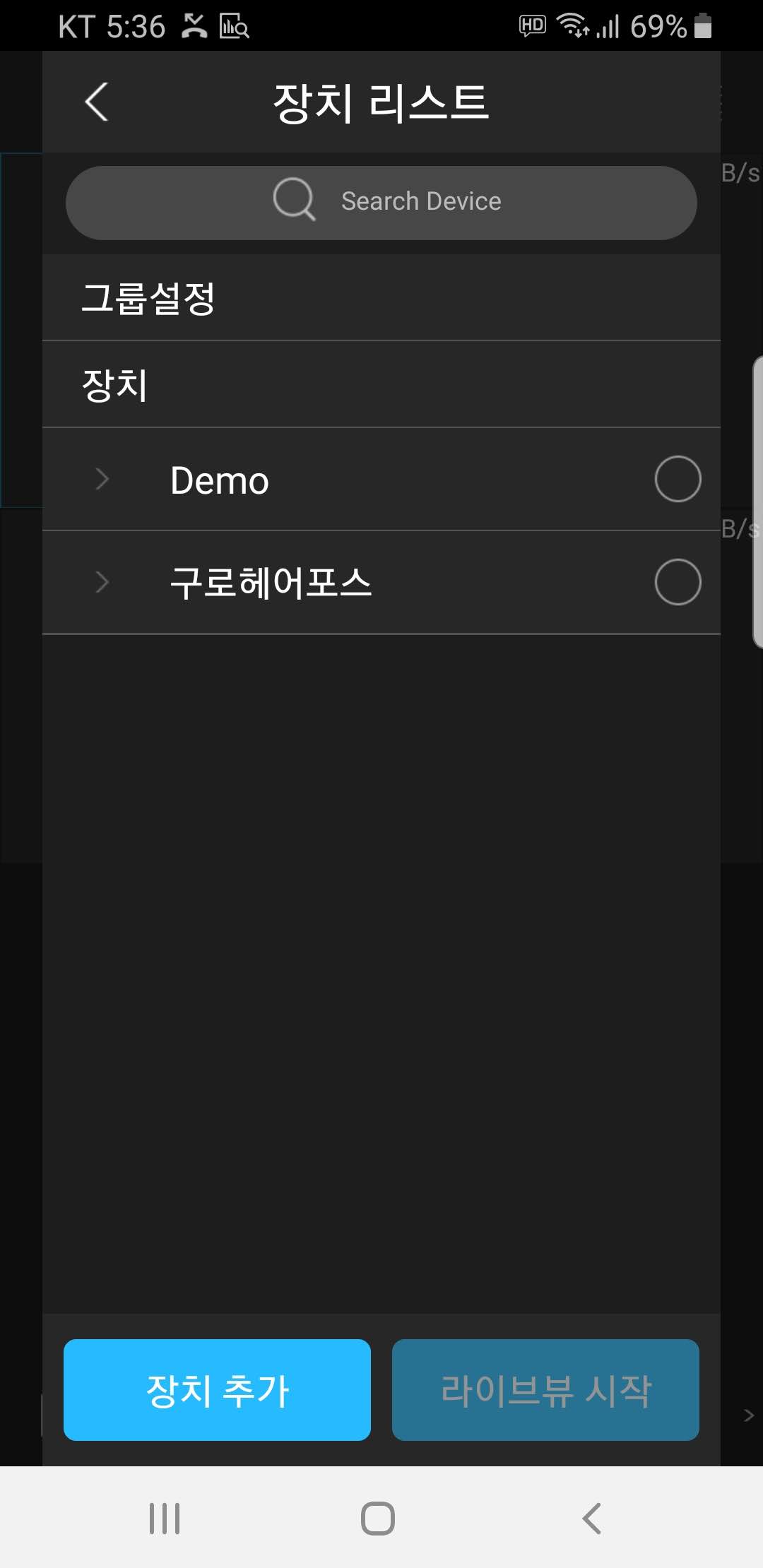 '실시간보기' 오른쪽으로 카메라모양의 아이콘 선택합니다. '장치리스트'에서는 맨 아래 '장치추가' 버튼을 누릅니다.