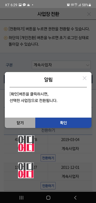 사업장이 2개인 경우에는 상단 오른쪽에 '사업장선택'