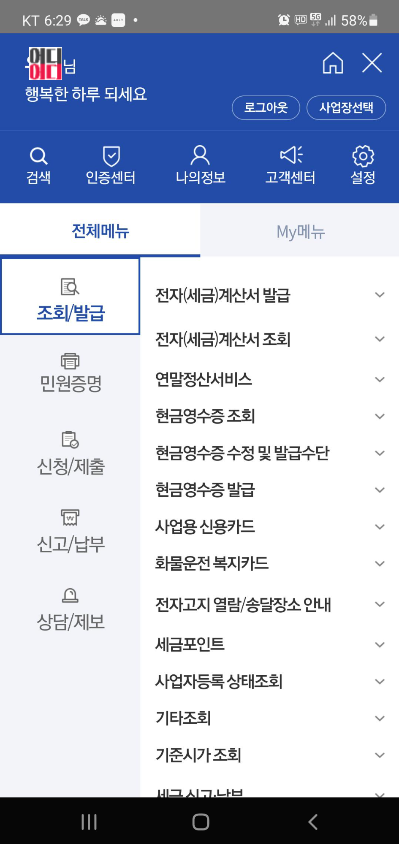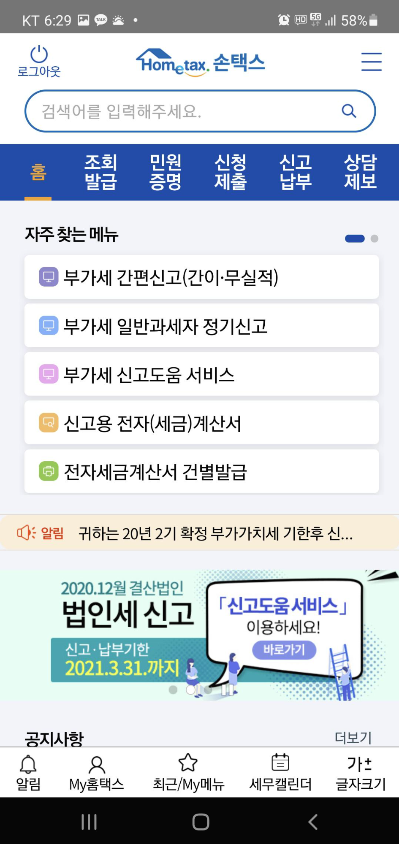 국세청 손택스 앱에 로그인 접속을 합니다.