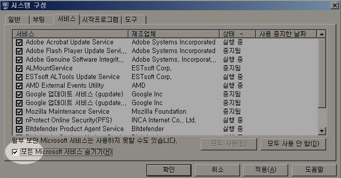 3. 모두 사용 안함을 클릭 한 후 적용을 클릭