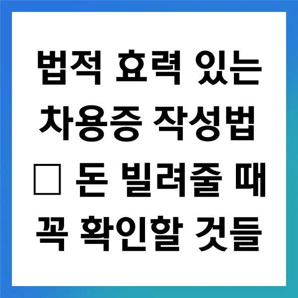 법적 분쟁을 예방하려면 사전 준비 가 중요하며, 철저한 준비가 곧 법적 안정성을 확보하는 길 입니다. 차용증 작성 과정에서 이 모든 요소를 꼼꼼하게 따져보는 것은, 추후 발생할 수 있는 문제를 방지하는 효과적인 방법이 될 것입니다. 신중한 접근 이 여러분의 금전적 안전망을 확보하는 확실한 길 입니다.