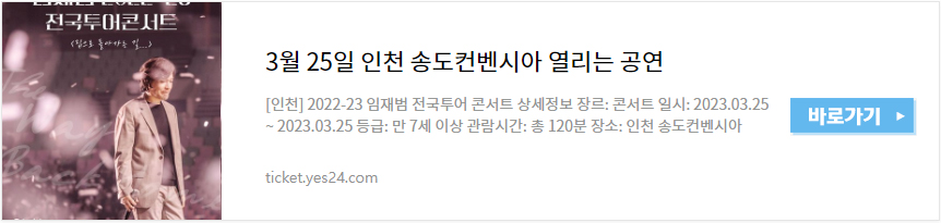 임재범의 2022-23 전국투어 콘서트가 진행 중이며, 이번 달 3월 11일 토요일 청주대학교 석우문화체육관, 3월 25일 토요일 인천 송도컨벤시아 열리는 공연이 각각 있습니다. 각각 예매할 수 있는 곳 링크 남겨드립니다.