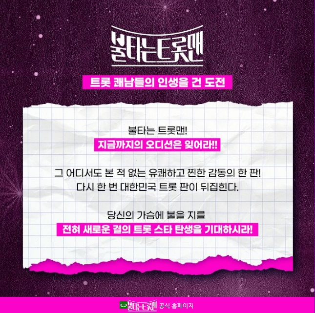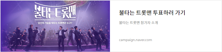 불타는트롯맨 인기가 대단합니다. 대한민국의 트롯트 경쟁 리얼리티 쇼! 매주 MBN 채널에서 화요일 밤 9시40분 부터 시작으로 12부작 예정인 가운데 있습니다. 트롯트의 재밌게 볼 수 있는 또 하나의 방법이 투표입니다. 매주 할 수 있고, 기다림이 아주 굿! 예전에 트롯을 몰랐던 시간이 이제는 트롯 없으면 안돼는 시간을 보내고 있는 1인! 그래서 투표 해 봤습니다.