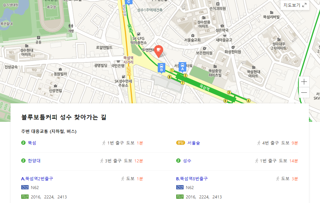 미국브랜드 스타벅스와는 경쟁업체죠. 우리나라 월드컵을 개최한 같은 해 2002년에 생겨났는데도 불구하고 세계인의 커피가게로 자리잡아 우리나라까지 오픈하게 되었습니다. 일본에 이어 3번째라고 합니다. 서울 성수동 뚝섬역 1번출구 입니다.바로 성수점 입니다.