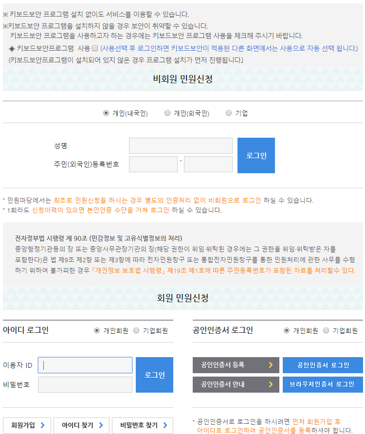 비회원신청, 회원 민원신청으로 구분됩니다.
