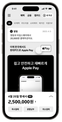 현재 국내에서는 비자·마스터·국내전용 현대카드만 애플페이에 등록해 사용할 수 있습니다. 애플페이를 사용하려면 아이폰14 이상의 모델이 필요합니다.