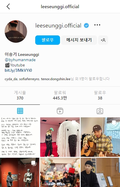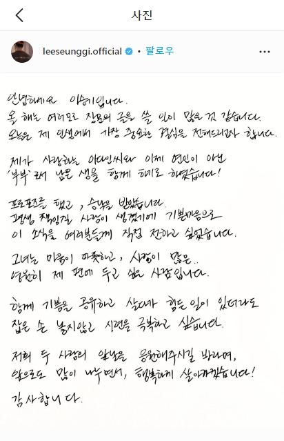 앞서 이다인 인스타그램을 봤으니 이승기도 보자! 이승기가 결혼한다는 팬들에게 보낸 글입니다. 오~이승기의 인스타에는 팔로우가 38이네요. 궁금해서 선택해보니 두번째에 약혼녀 이다인 있네요^^