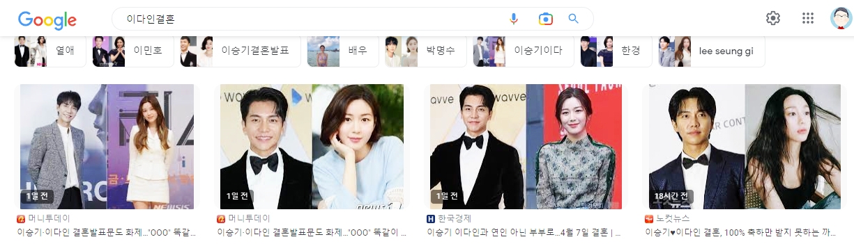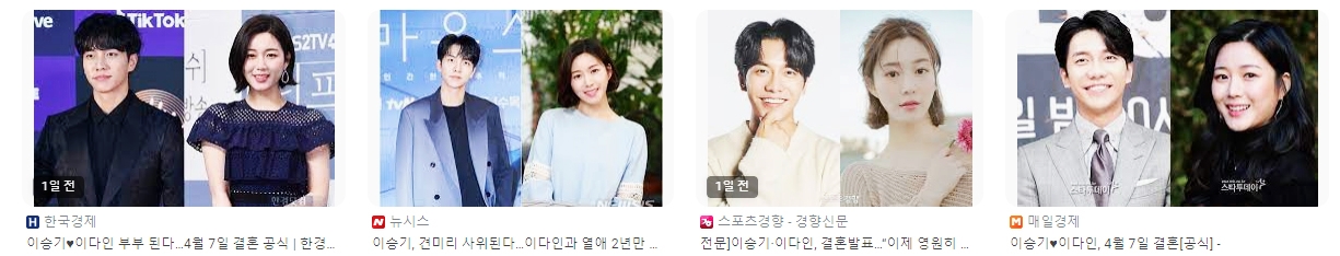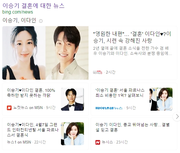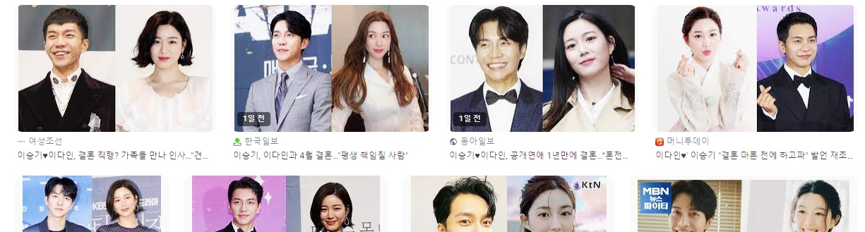 그들의 인터넷 포털에서 얼마나 많은 지 검색란에 '이'만 넣었는데 '이승기결혼' 아래에 뜨네요. 어제까지 계속 인기검색어에 이승기, 이다인 보입니다. 저도 그래서 기사에 없는 것 찾아 글을 써봤네요. 이미 알고 있는 이야기도 반이 넘긴 했지만~