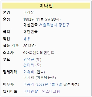이라윤은 배우 견미리의 둘째 딸로 배우 이유비의 여동생으로 잘 알려진 배우이며 아버지는 배우 임영규이다. 개명 전 이름은 이주희에서 이다인으로, 2022년 6월 다시 이라윤으로 개명했다. 위키백과에서 이다인을 검색하면 본명 이라윤으로 되어있다. 견미리는 딸의 일이 잘 풀리지 않아 이름을 바꿨다고 한다. 딸들의 미래와 평화를 위해 바꿨다고 한다.
