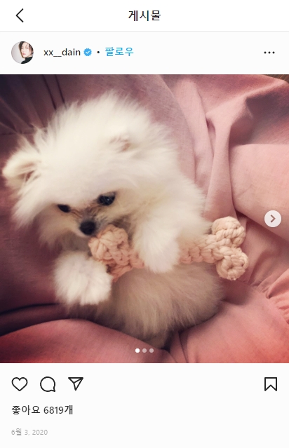 이다인의 인스타그램은 이렇게 여성스러움과 함께 아름다운 모습 일상들을 볼 수 있습니다. 털복숭이 반려견도 핑크색 속에서 귀엽게 찍혔습니다.
