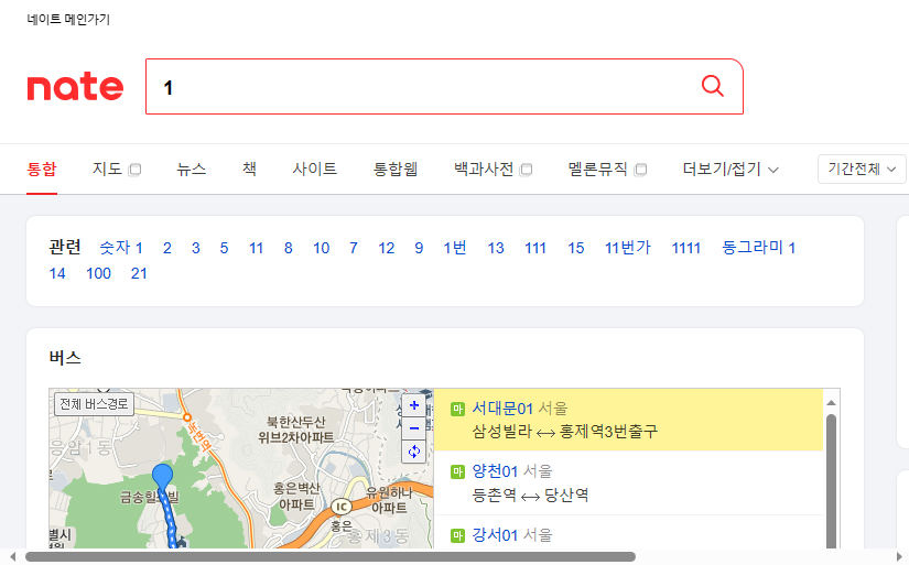 👉🏻숫자1 검색결과: 버스정보가 나옵니다. 네이버와는 차이가 있습니다.