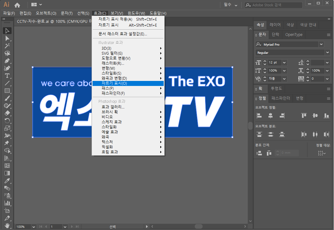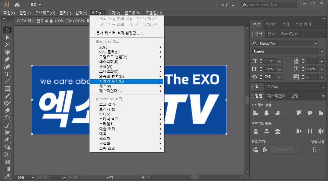 한글일러스트에서는 위와 같이 '자르기 표시' 사용됩니다. 영문에서는 메뉴 중에 Effect 아래 'Crop Marks' 입니다.