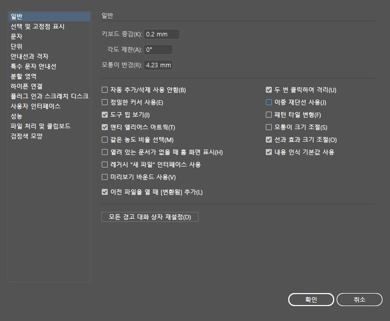 위와 같은 내용으로 보입니다. 오른쪽 보시면 '이중 재단선 사용' 이렇게 되어 있습니다. 그 체크박스를 제거하고 아래 확인 누르시면 끝입니다. 영문일러스트의 경우 이 정도 위치에 있습니다. 내용들이 상하배열이 다르니 잘 보시면 됩니다.