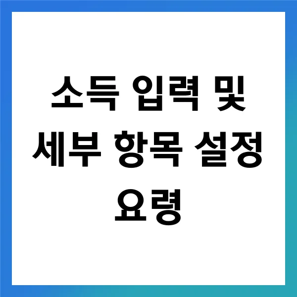 소득세 신고에서 핵심 은 정확한 소득 입력과 세부 항목 설정 입니다. 정확한 소득 입력이 없다면, 세금 납부액 또한 잘못 계산될 가능성이 큽니다. 종합소득세 계산기를 효과적으로 사용하려면, 소득의 종류와 출처를 명확히 파악 하는 것이 중요합니다. 종합소득세는 다섯 가지의 주요 소득으로 구분됩니다: 이자, 배당, 사업, 근로, 연금 소득. 각각의 소득 항목에 대해 구체적인 수치를 입력 해야 합니다.