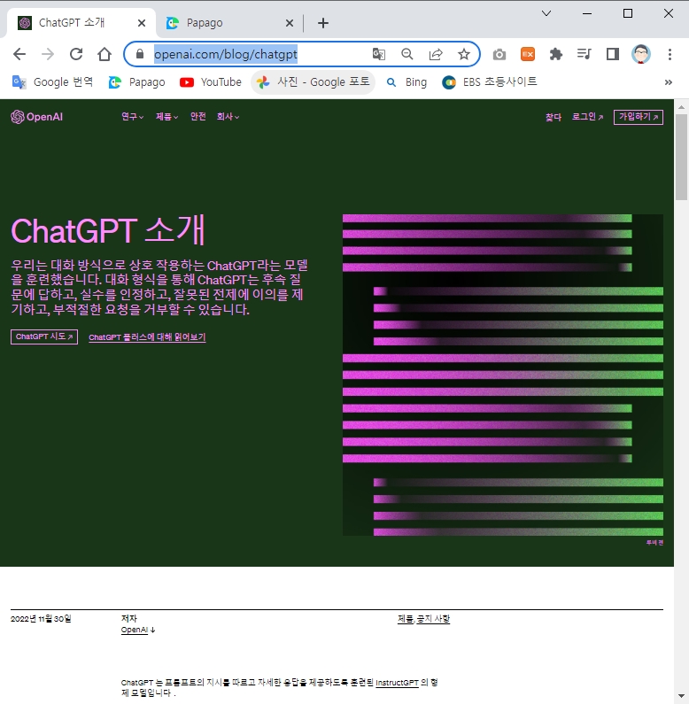 설명 챗GPT, 파파고 웹페이지를 각각 구분해서 오픈합니다.