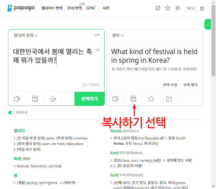 설명 질문의 답 나오면 문장 선택 복사 → 파파고 번역 → 끝!
