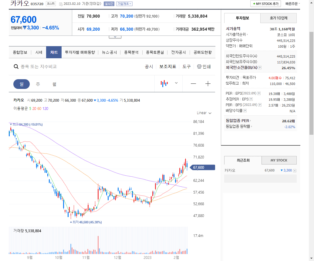 Kakao Corporation은 한국 기술 회사로 한국에서 가장 큰 메시징 플랫폼을 운영합니다. 카카오의 주가는 현재 약 4.20달러에 거래되고 있으며 시가총액은 약 80억 달러다. 카카오의 주가는 2016년 6월 사상 최고점부터 최근 코로나19 시장 변동성으로 인한 하락까지 롤러코스터를 타고 있다. 한국에서 빠르게 성장하는 기술 산업에 관심이 있는 투자자는 이 고부가가치 부문의 잠재력을 반영하는 카카오 주식에 대한 투자를 고려해야 합니다.