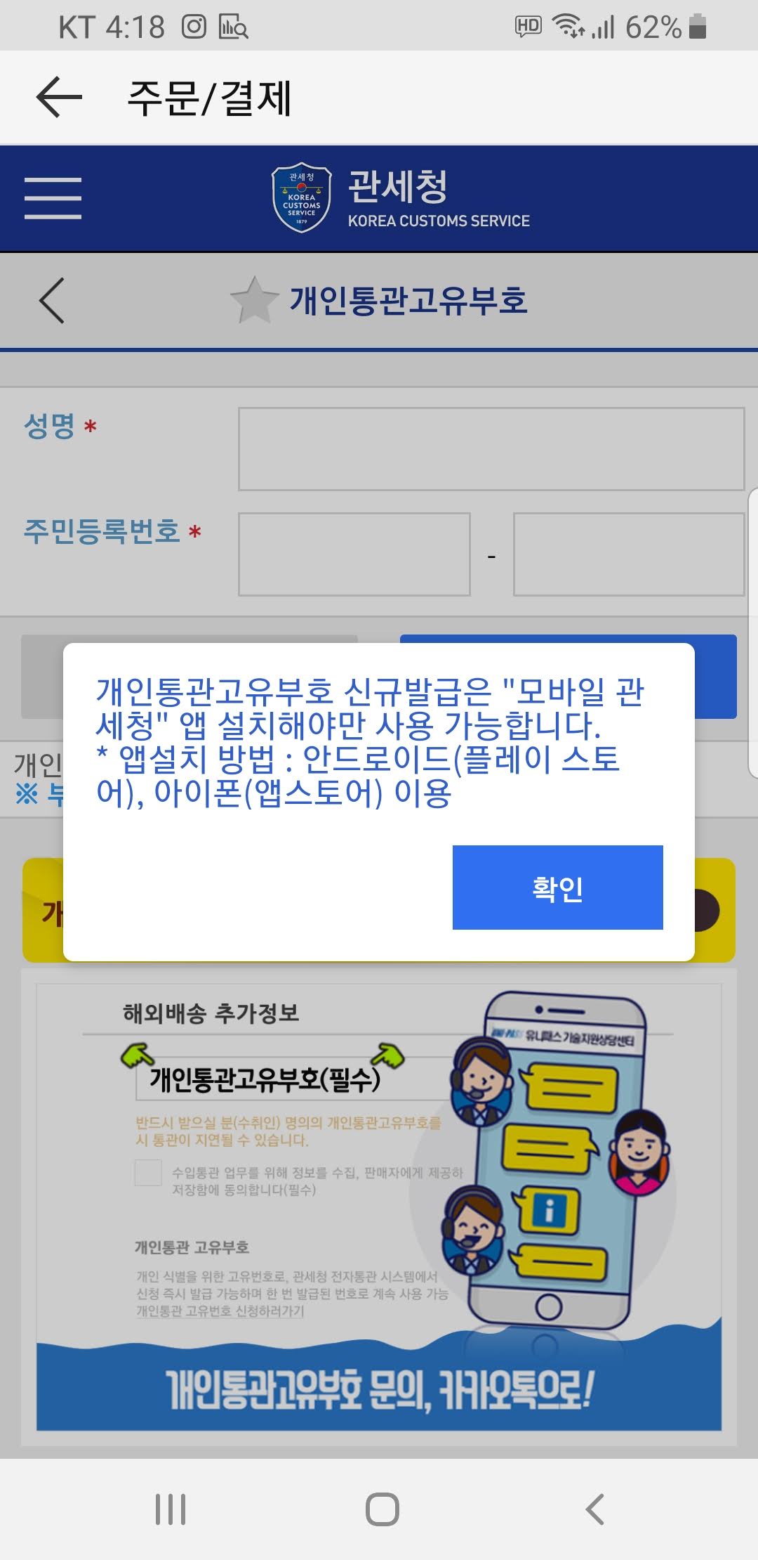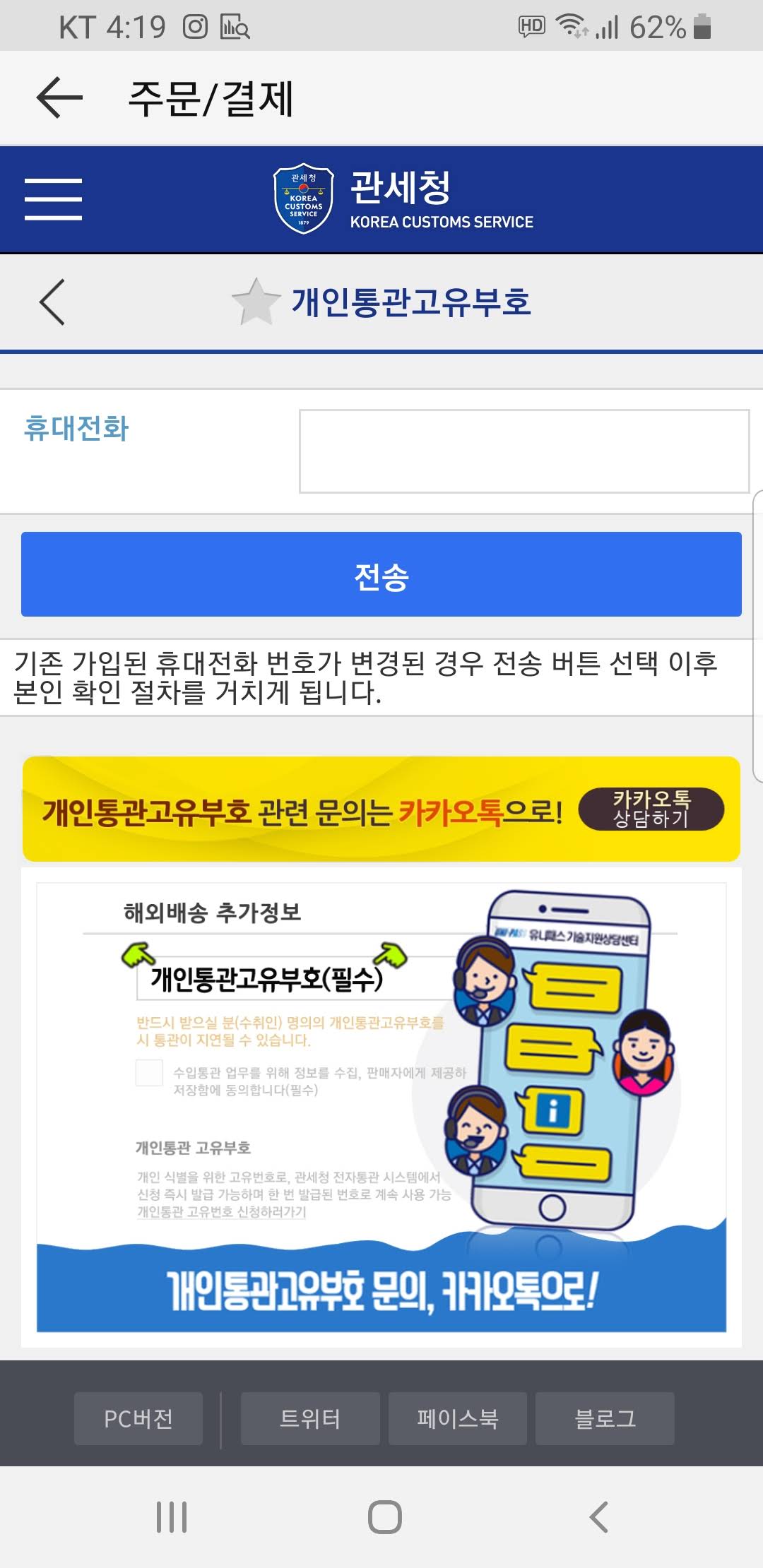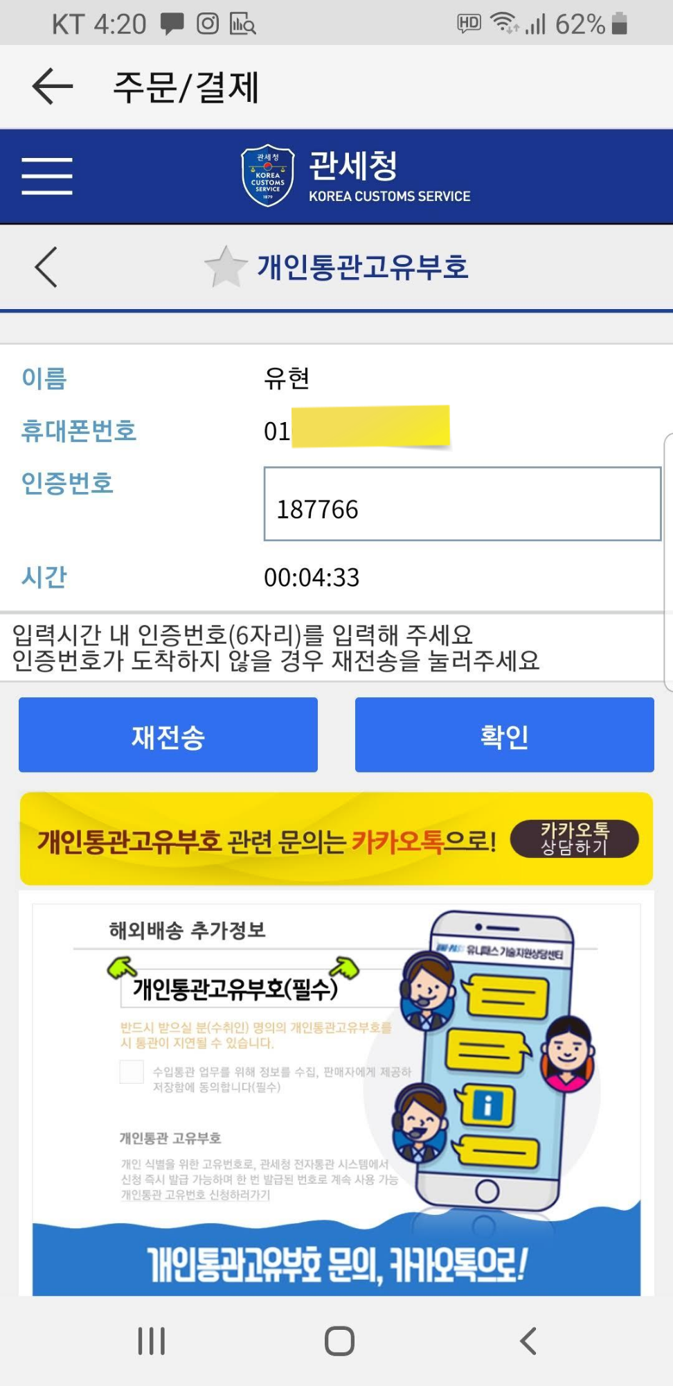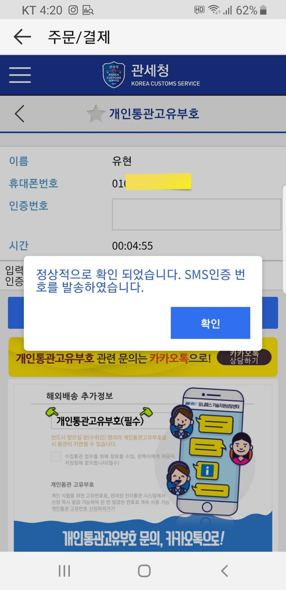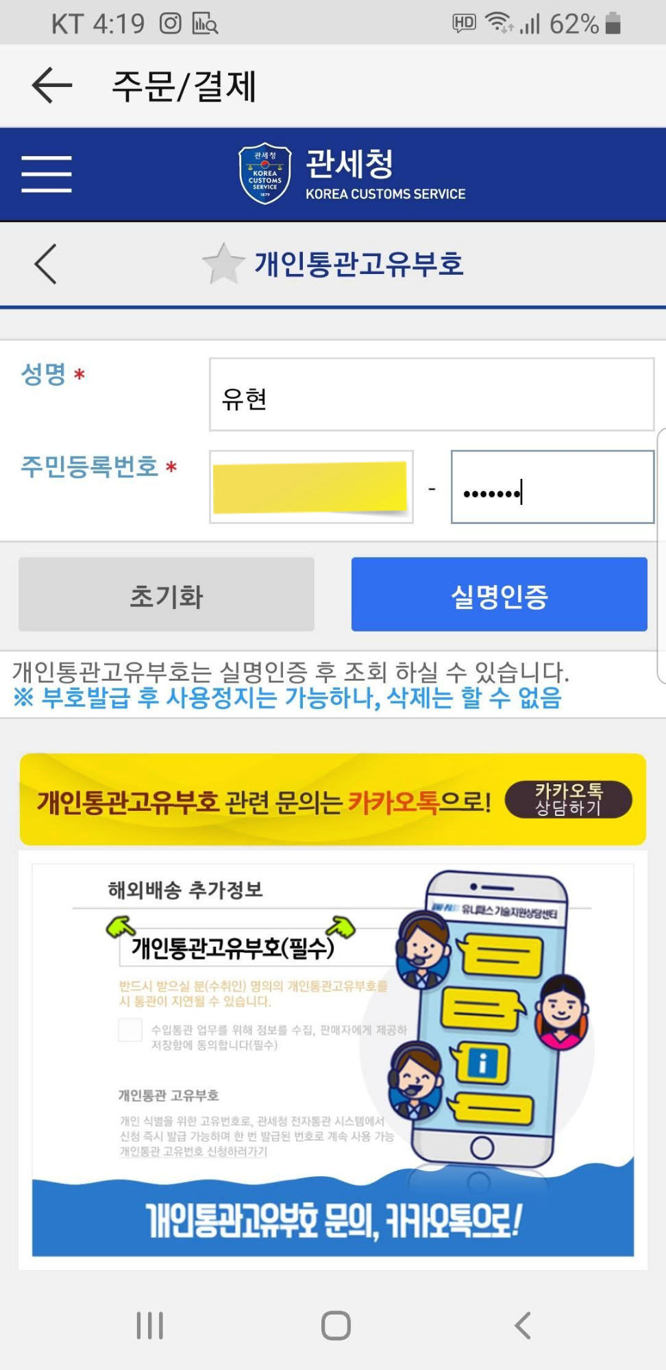 본인 인증이 완료되면 개인통관고유부호