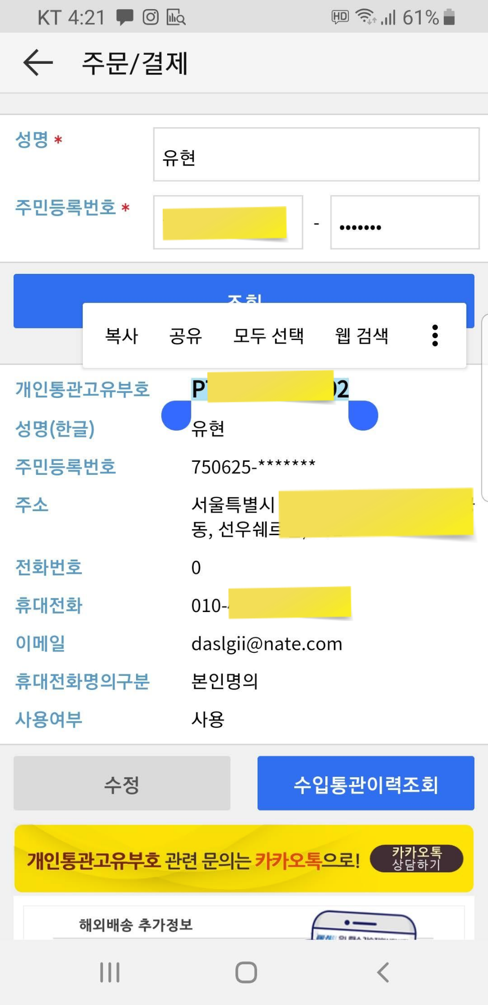 어쩔 수 없이 오래전 개인통관부호 확인해