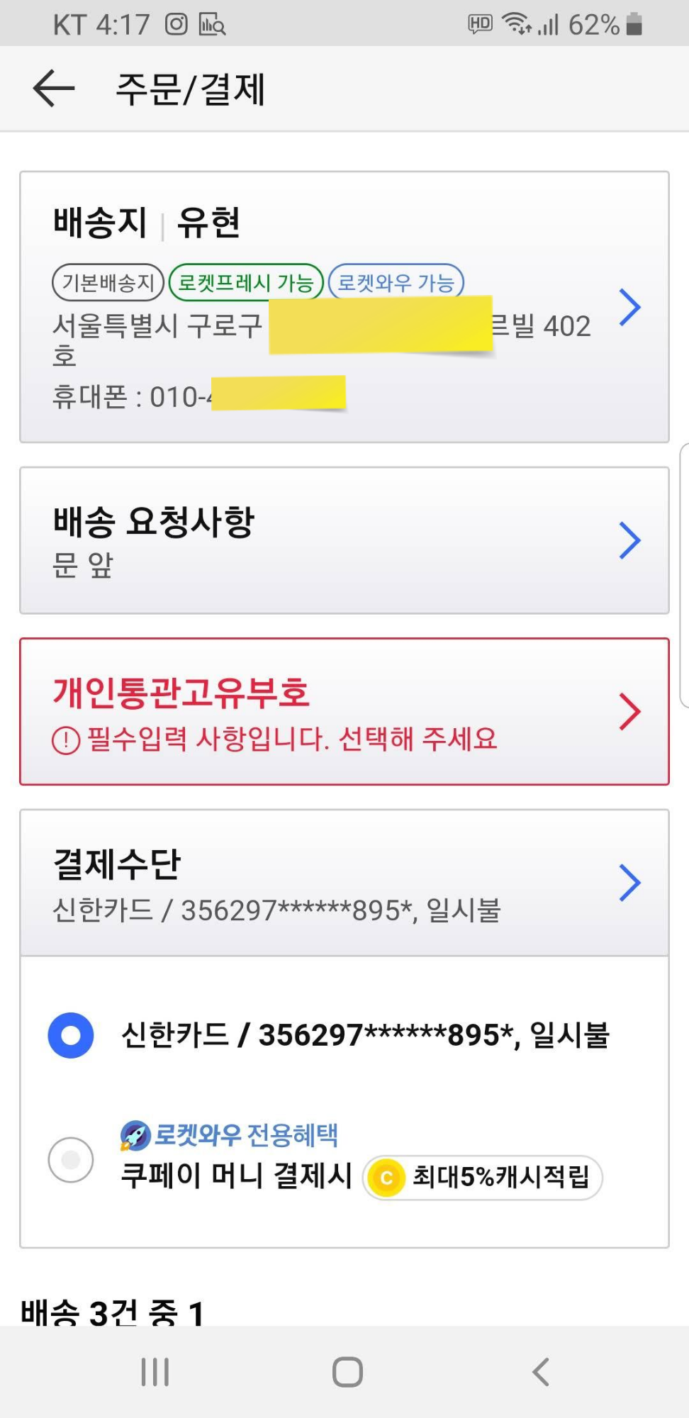 "쿠팡로켓직구 사용을 위해 2분 안에 개인통관고유부호 확인해 결제해 봅니다"