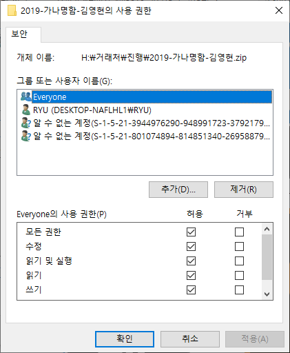 아래 보시면 '그룹 또는 사용자 이름(G)'