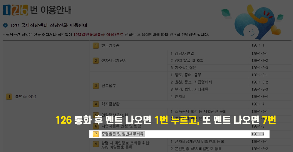 전화를 통해 친절한 상담원을 통해 안내 받으셔도 편리합니다.126번은 국세청의 국세상담센터 전화번호로, 세법이나 홈택스 이용방법 등 국세와 관련하여 문의가 있는 납세자는 전국 어디서나 국번 없이 126으로 전화하여 상담을 받을 수 있습니다. 일반 상담은 평일 오전 9시부터 오후 6시까지 운영됩니다.