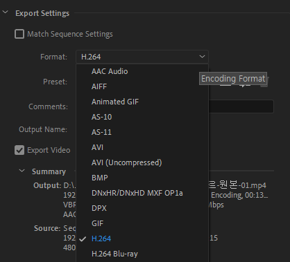 ctrl+M을 사용합니다. H.264 포멧선택.
