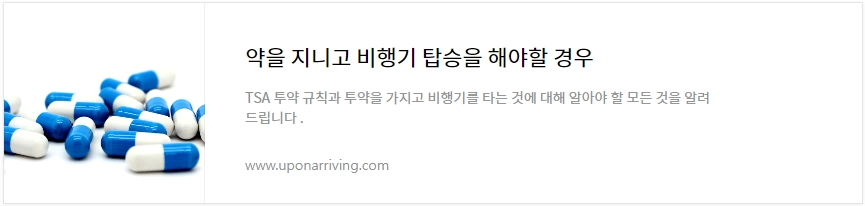 먼저, TSA는 고체 약물 (알약 등)에 대한 제한이 없습니다. 그러므로, 급한 상황을 대비하여 여행에 필요한 의료용 약물을 챙겨가는 것은 괜찮습니다. 해외 여행전 꼭 숙지해야 할 내용을 담고 있는 웹사이트를 소개합니다.