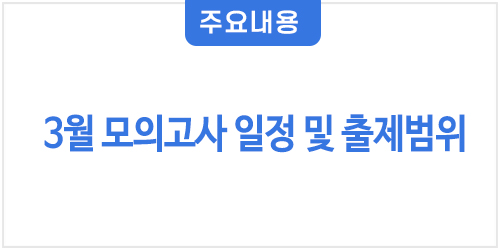 3월 모의고사 범위는 고2번위 입니다. 교육청 모의고사는 자신이 자만의 길이냐 노력의 길이냐를 자신에게 물을 수 있는 경험이 됩니다. 따라서, 잘 준비해서 6월 한국교육과정평가원 모의고사와 수능까지 성적이 잘 나올 수 있도록 합시다. 결론, 3월 모의고사를 무시하면 절대 안됩니다.