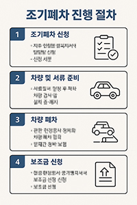 - 폐차장 상담·서류 접수 — 관허 폐차장에 전화 → 차량등록증/신분증/통장사본 제출(대행 가능)
